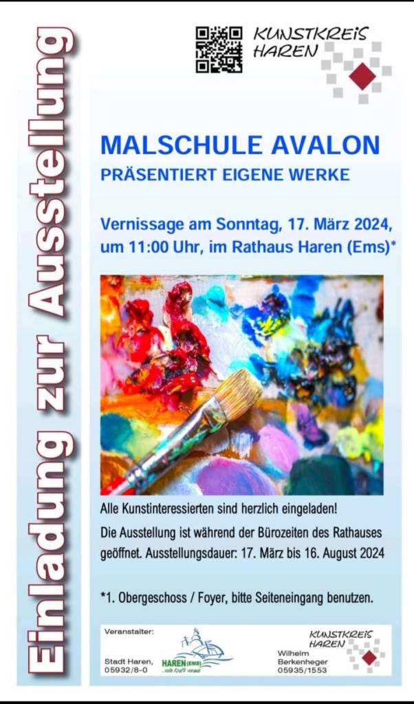 Sechzehn Künstlerinnen der AVALON-Gruppe präsentieren ihre Werke im Rahmen einer Gemeinschaftsausstellung, vom 17. März bis zum 16. August 2024, im Harener Rathaus. Dort ist die Ausstellung während der Bürozeiten des Rathauses geöffnet. Zur Vernissage am 17. März hoffen die Malschule Avalon, die ausstellenden Künstlerinnen und der Kunstkreis Haren auf regen Zulauf und einen kreativen, inspirierenden Austausch.